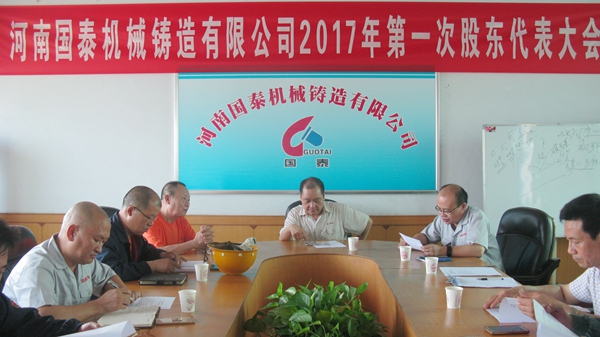 公司2017年第一次股東代表大會(huì )于2017年8月3日在公司三樓小會(huì )議室召開(kāi),會(huì )議由河南國泰機械鑄造有限公司董事會(huì )召集。股東方代表濟鋼常務(wù)副總經(jīng)理周為民及其他14名股東代表出席了會(huì )議,3人因事缺席,會(huì )議的召集、召開(kāi)形式和程序符合《中華人民共和國公司法》和《河南國泰機械鑄造有限公司章程》的有關(guān)規定,會(huì )議合法有效。